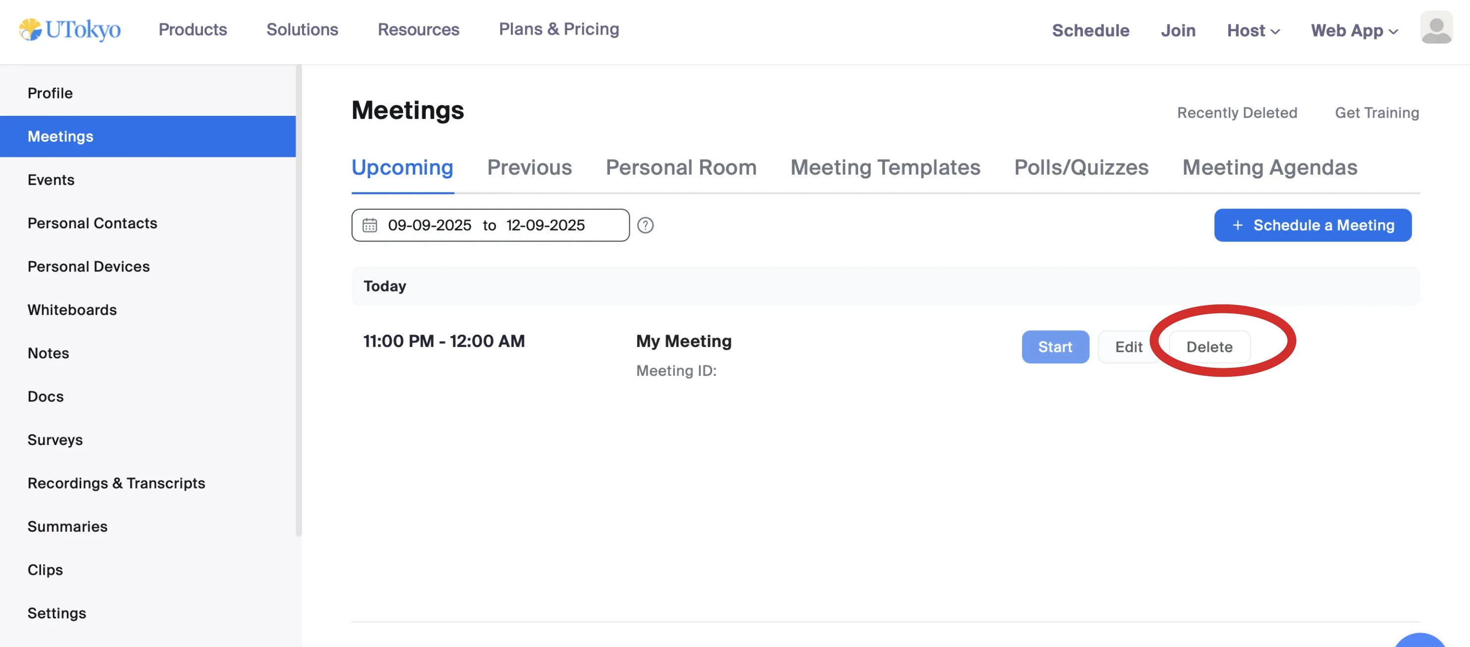 2. Click Delete to delete the meeting.