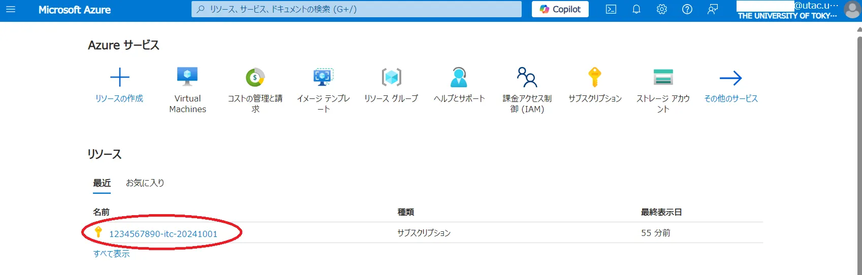 Azure portalにUTokyo Accountでログインし、リソースの欄にサブスクリプションがない場合(下図参照),先に以下のURLからサブスクリプションを申請してください.