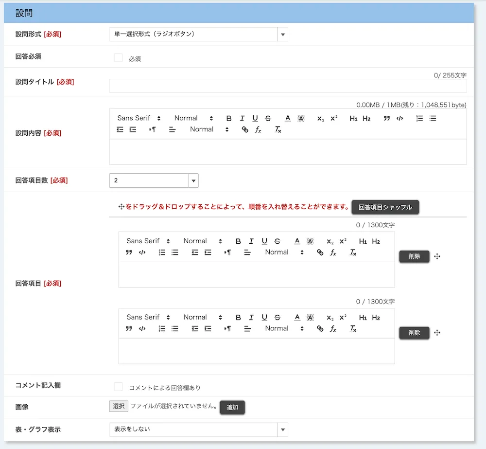 • 設問内容:設問の上に表示される説明文です.マークアップが使えます.