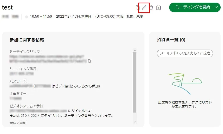• 出席者に入力していない出席者にも,表示されたミーティングリンク・ミーティング番号・パスワード等をメールで周知することができます.主催者キーは,主催者のみが知るべき番号なので,一般の出席者には周知すべきではありません.