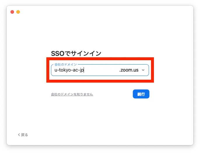 3. 「会社のドメイン」の欄に,u-tokyo-ac-jpと入力してください(acの前後はピリオドではなくハイフンであることに注意してください).