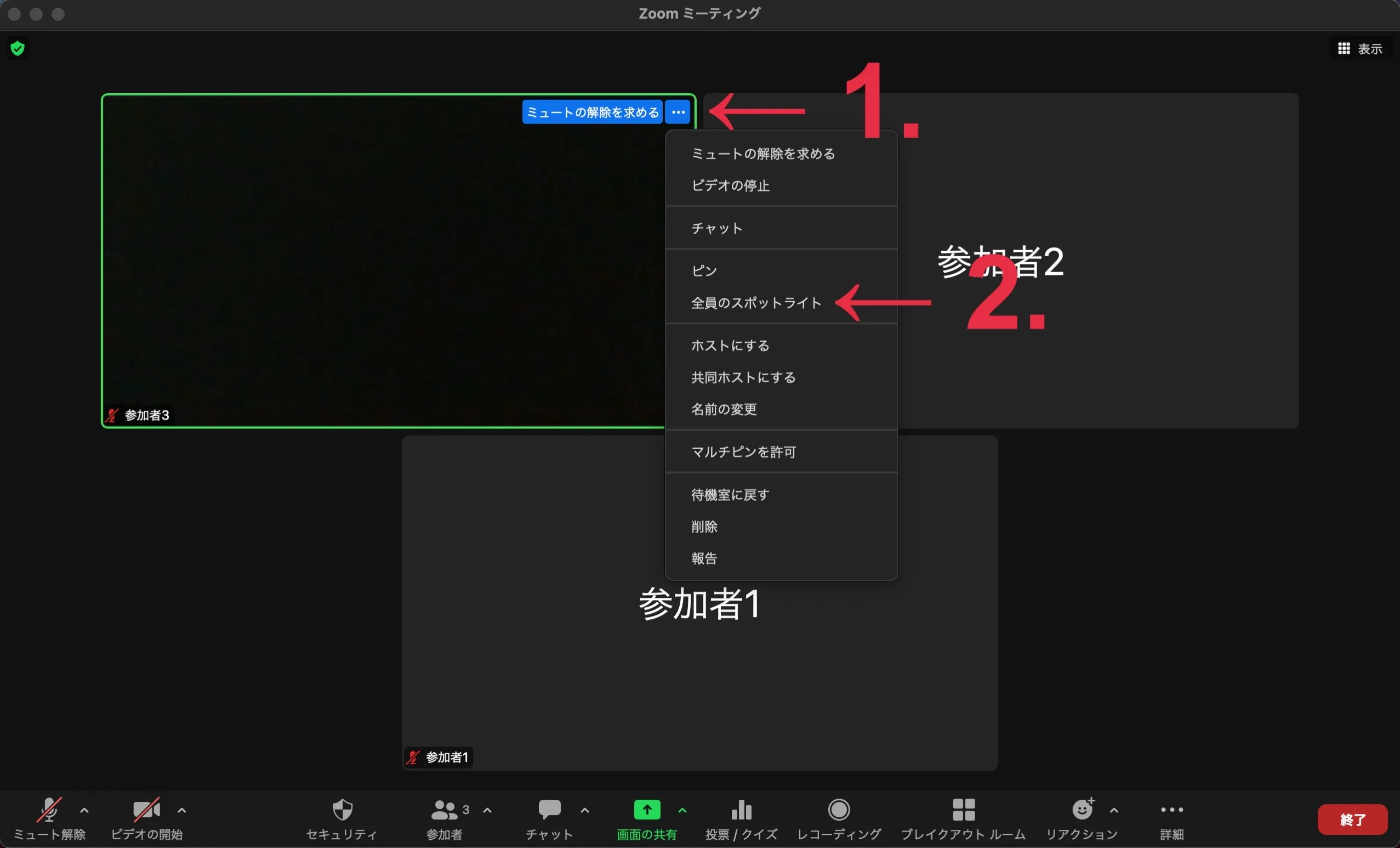- メニューから「全員のスポットライト」をクリックしてください.